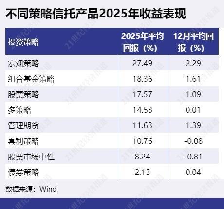 1、4只股票型信托2025年收益率翻倍从不同策略的表现来看,2025年收益表现最佳的策略为宏观策略,采用宏观策略的信托产品2025年平均回报达27.49%。其次为组合基金策略,平均回报达18.36%,主要是FOF产品表现较佳,FOF产品2025年平均回报为18.38%。