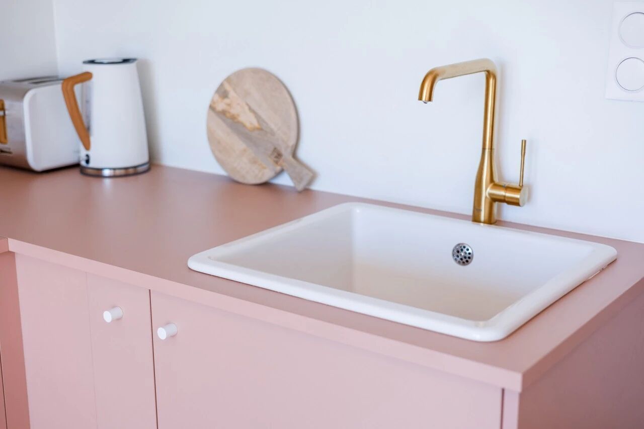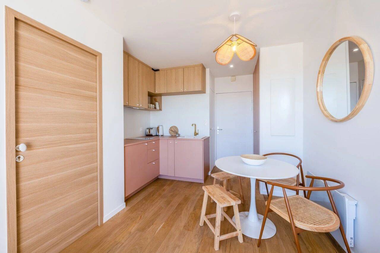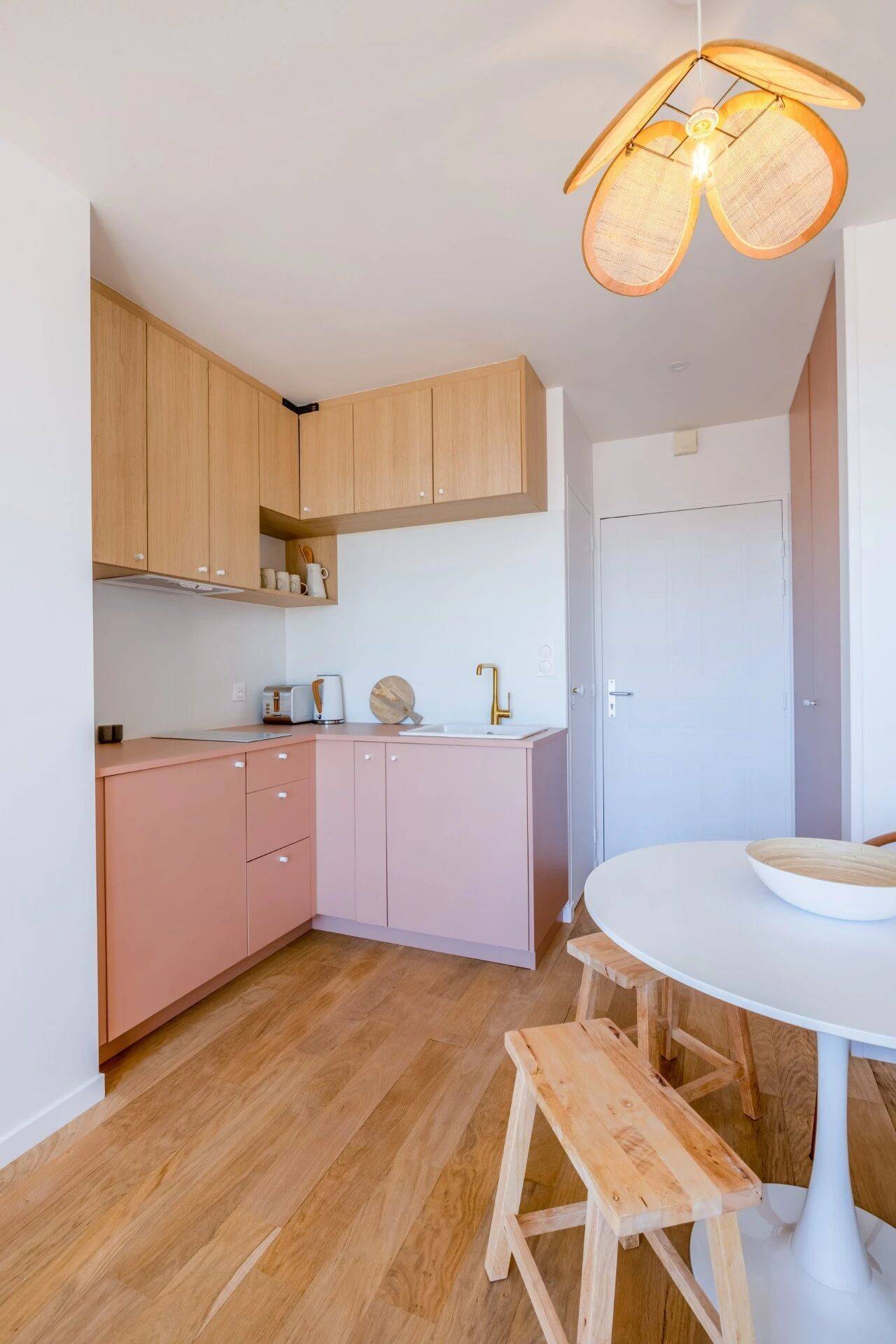 隔墙的设计提升了厨房各功能区的融合度,厨房顺势打造为L型布局,进一步拓展了储物空间。为烘托温馨氛围、赋予独特质感,设计师团队选用柔粉色系的柜体,与橡木饰面板的高柜相搭配,碰撞出别致的视觉效果。