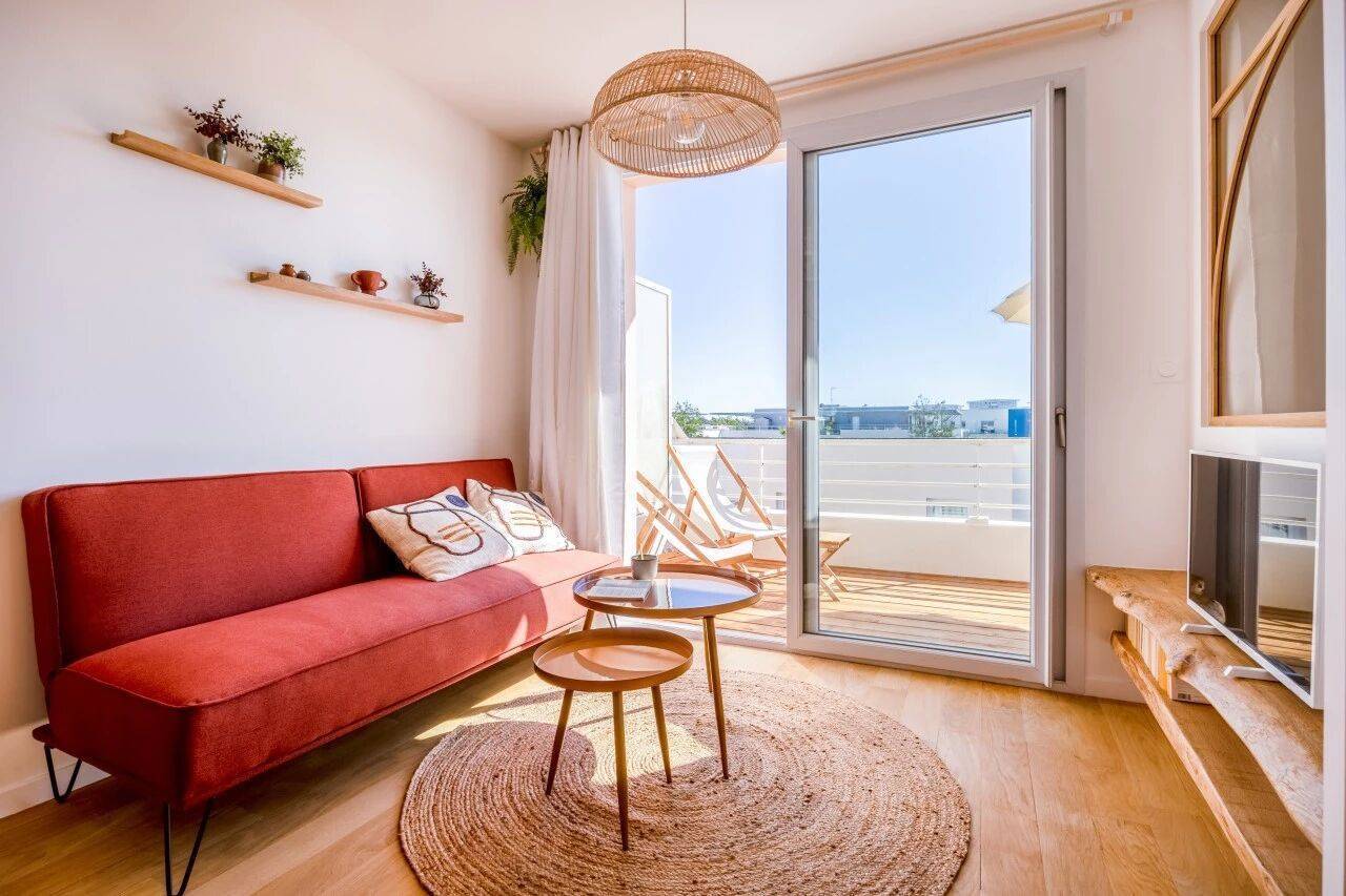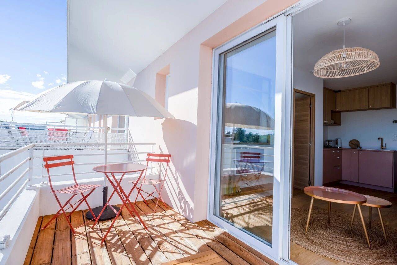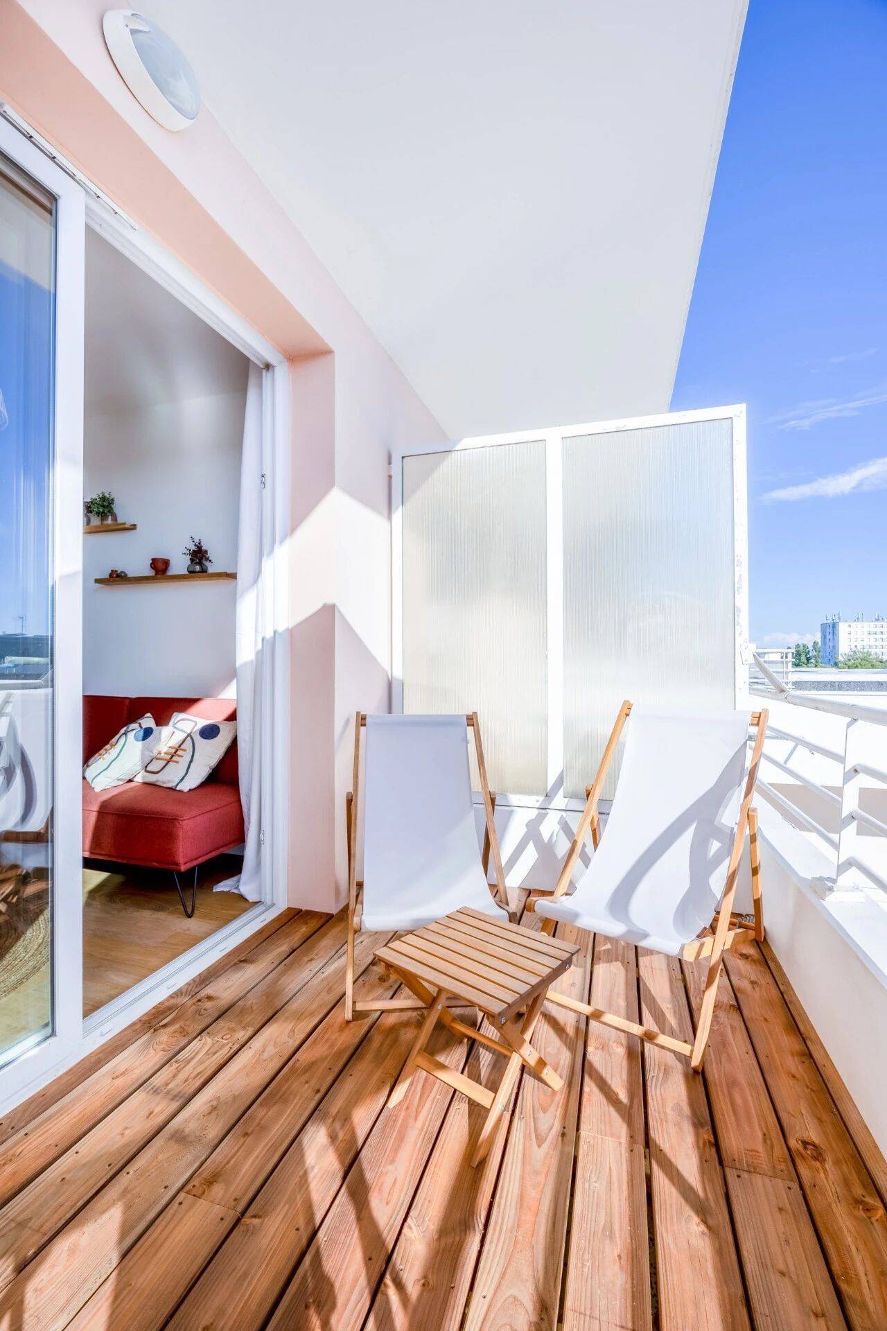露台区域,设计师选用松木户外地板,打造出室内外空间的视觉与质感衔接。这方极简风格的露台,因一抹红色系金属家具焕发生机,与客厅的柔粉色调形成和谐呼应。