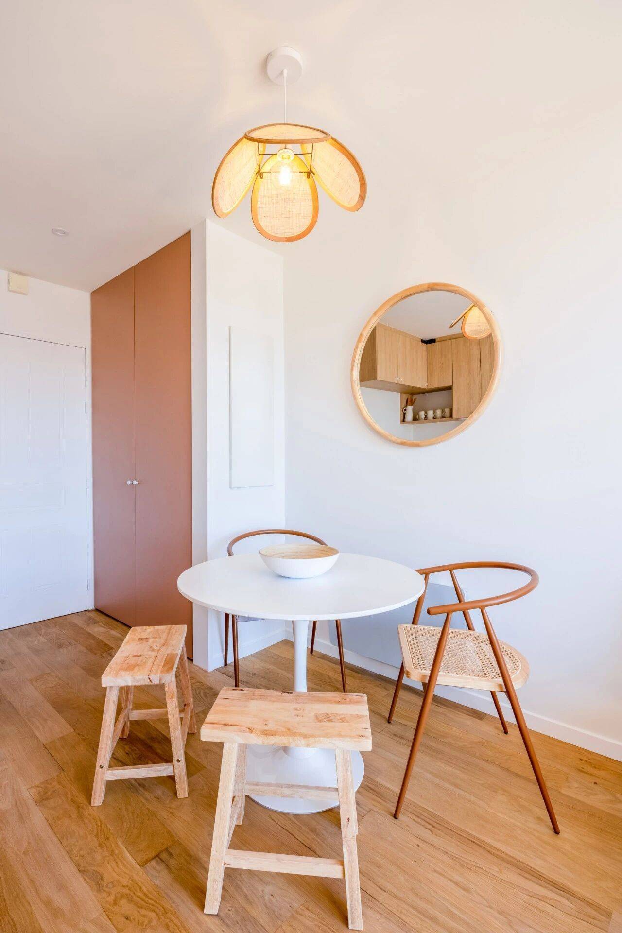 餐区小巧实用,设于厨房对面、入户门后方的位置,摆上一张圆形餐桌,搭配数把浅木材质的餐椅与高脚凳,营造出温馨又质朴的惬意氛围。
