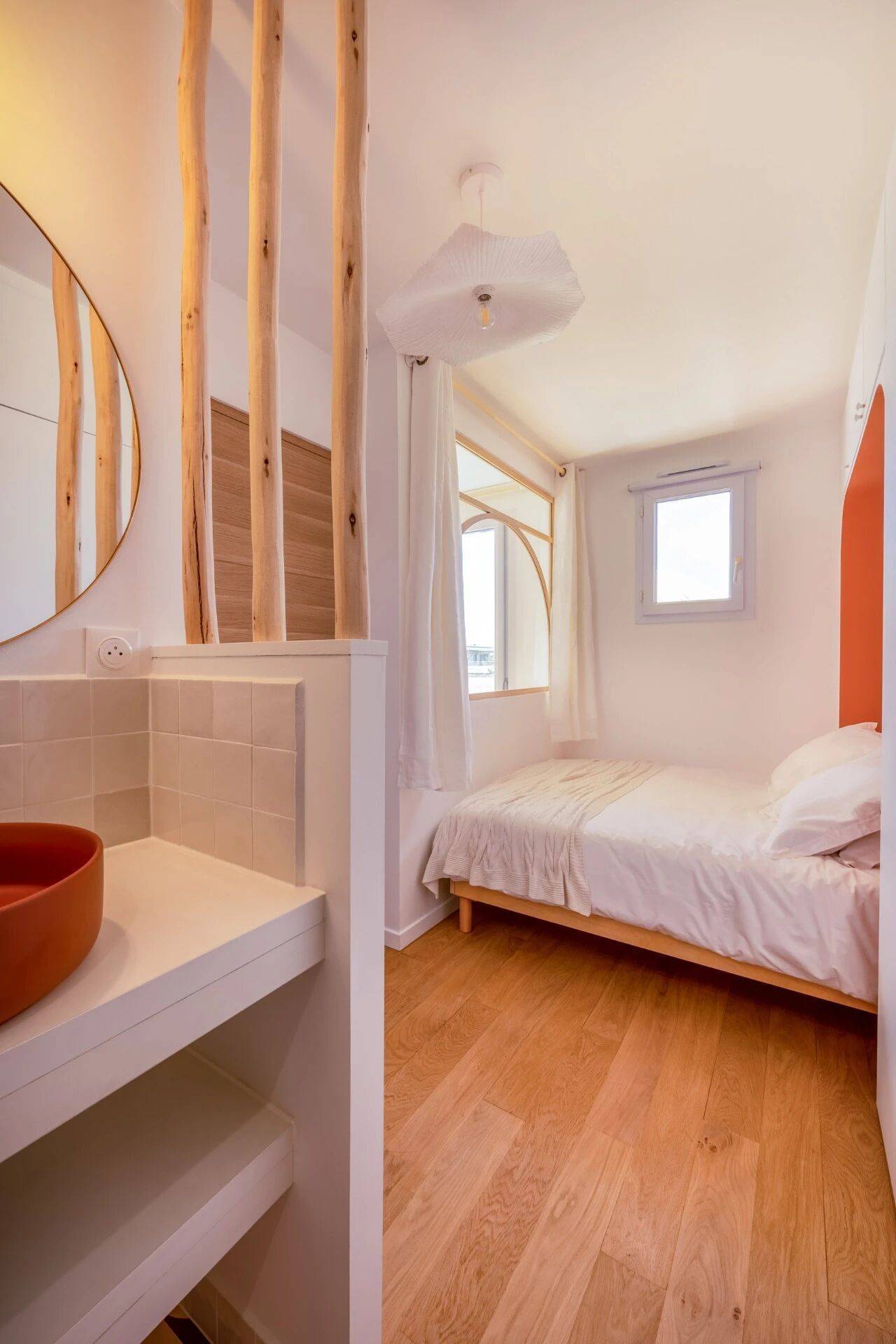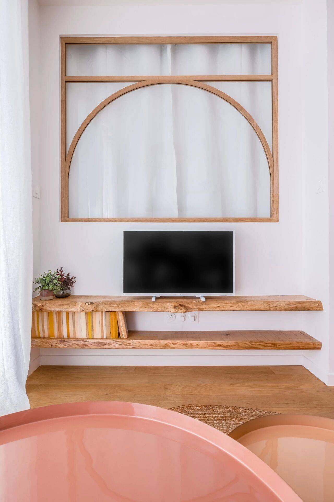 造型采用弧形线条设计,与公寓利落的直线条形成鲜明对比。更重要的是,它能让客厅的自然光线一路透入仅有一扇小窗的卧室。考虑到睡眠区配有开放式卫浴,设计师还特意加装了窗帘,以解决隐私方面的需求。