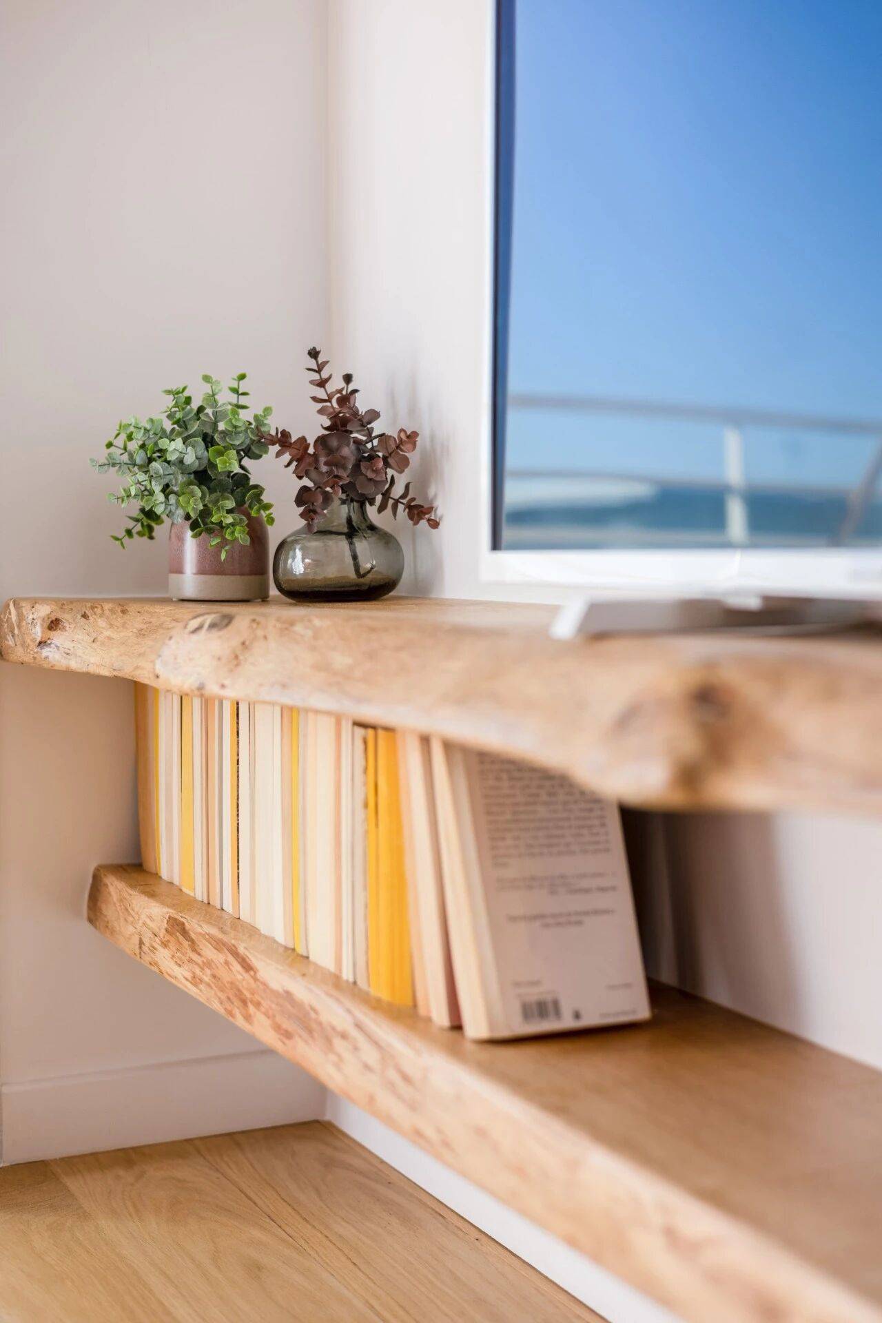 对面原本放置大书桌的位置,两组原木搁板巧妙嵌入玻璃天棚下方,兼具电视柜与书架的功能。这套定制的省空间收纳设计,沿用了作为本案装饰灵感起点的海滨风格设计元素。
