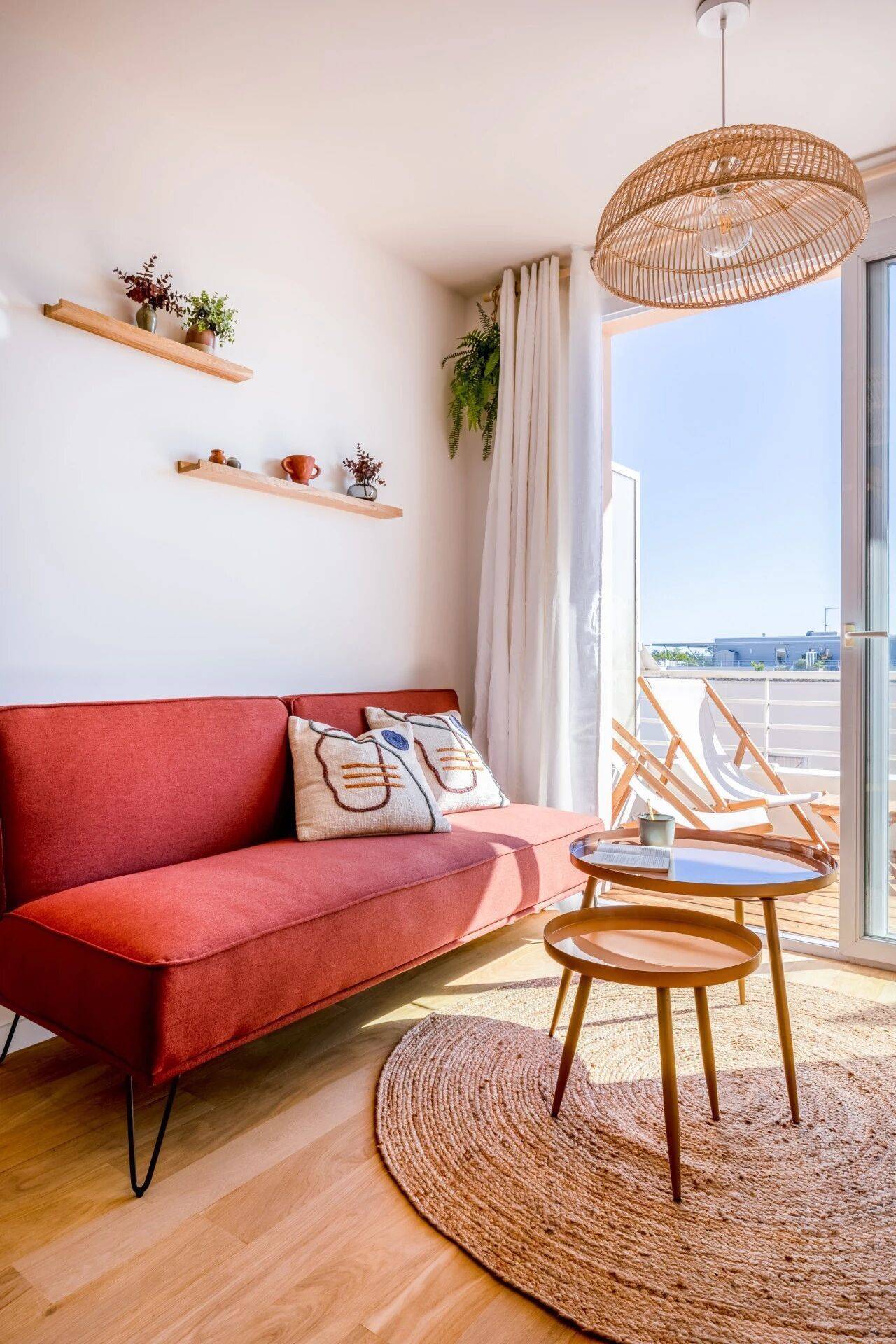 砖红色沙发为素雅的整体装修增添了灵动活力,与两张彩色套叠边桌相得益彰。