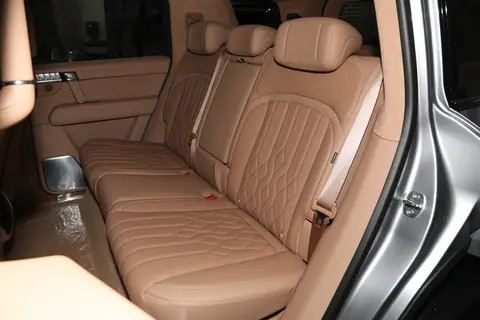 车身侧面堪称整个造型的点睛之笔。它没有沿用老派越野车直上直下的锐利线条,而是通过大量圆润的过渡处理,搭配多条富有力量感的肌肉线条,将车身勾勒得极具立体感。作为一款大型SUV,其车身尺寸相当可观:5100mm的车长、近2米的宽度、接近1.9米的高度,再加上3005mm的轴距,营造出宽大稳重的视觉效果,给人满满的安全感。侧面线条简洁利落,没有多余装饰,呈现出耐看的简约风格。越野风格的轮毂搭配夸张尺寸的轮胎,让人一眼就能感受到它应对复杂路况的底气。