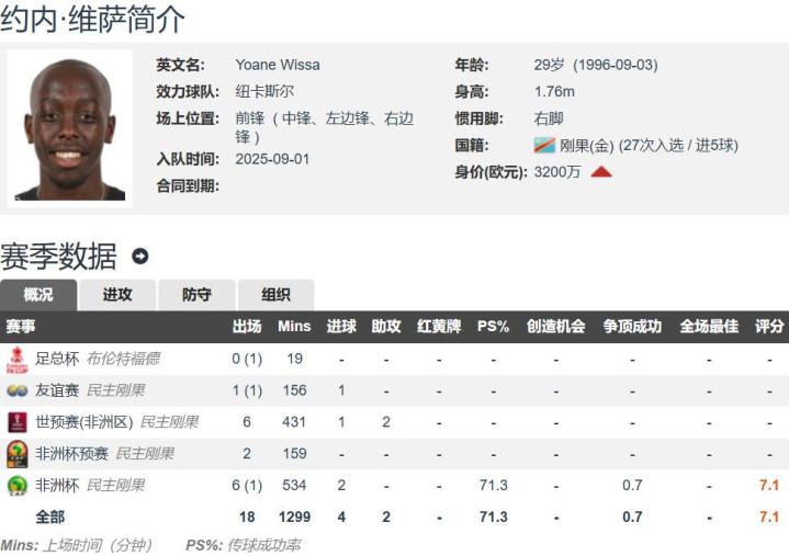 维萨现年29岁,身高1.76米,右脚球员,能踢中锋和边锋,德转估价3200万欧元,上赛季代表布伦特福德出战了35场英超的比赛,打入了惊人19个进球,还有4次助攻。