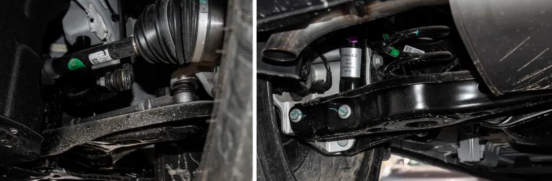 底盘中规中矩,这价位常见的麦弗逊+E型多连杆,单层冲压的钢制下摆臂,铝合金羊角,元宝梁的副车架。不过平整性做的还是不错的,护板、隔热、加强筋都很全。