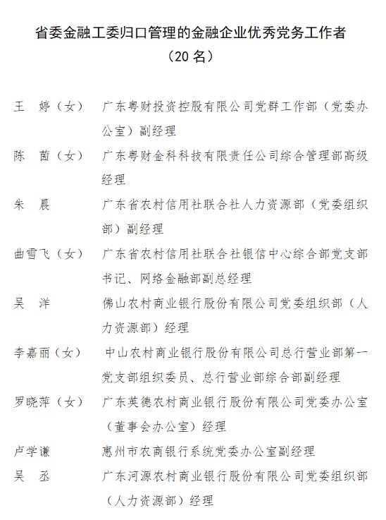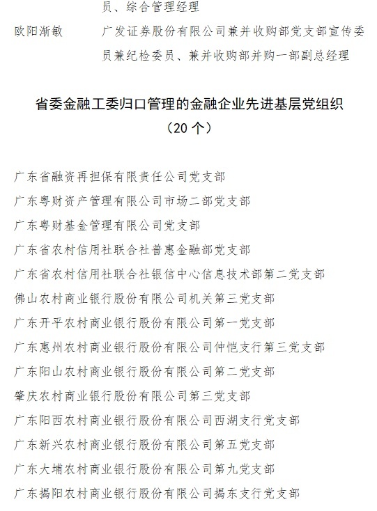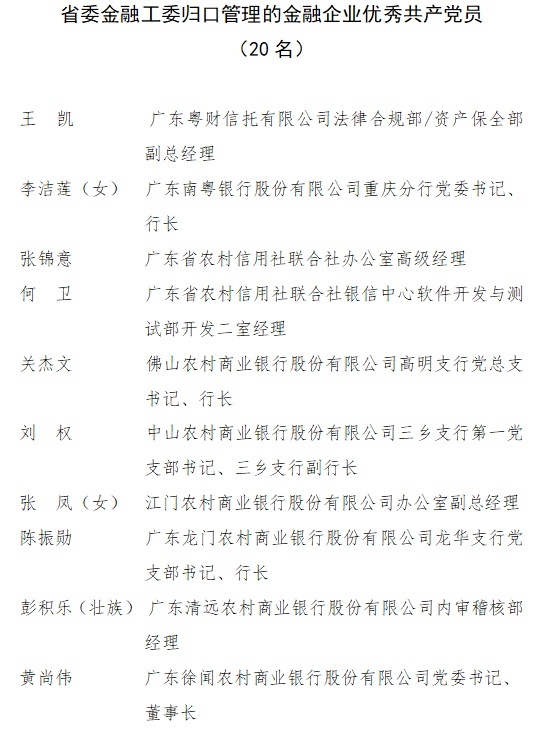 据“广东金融”微信公众号消息,为进一步抓典型、树标杆、正风气,激励归口管理的金融企业各级党组织和广大党员干部积极创先争优,持续营造担当作为干事创业的浓厚氛围,日前,省委金融工委决定,授予王凯等20名同志“省委金融工委归口管理的金融企业优秀共产党员”称号,授予王婷等20名同志“省委金融工委归口管理的金融企业优秀党务工作者”称号上海配资门户,授予广东省融资再担保有限责任公司党支部等20个基层党组织“省委金融工委归口管理的金融企业先进基层党组织”称号。
